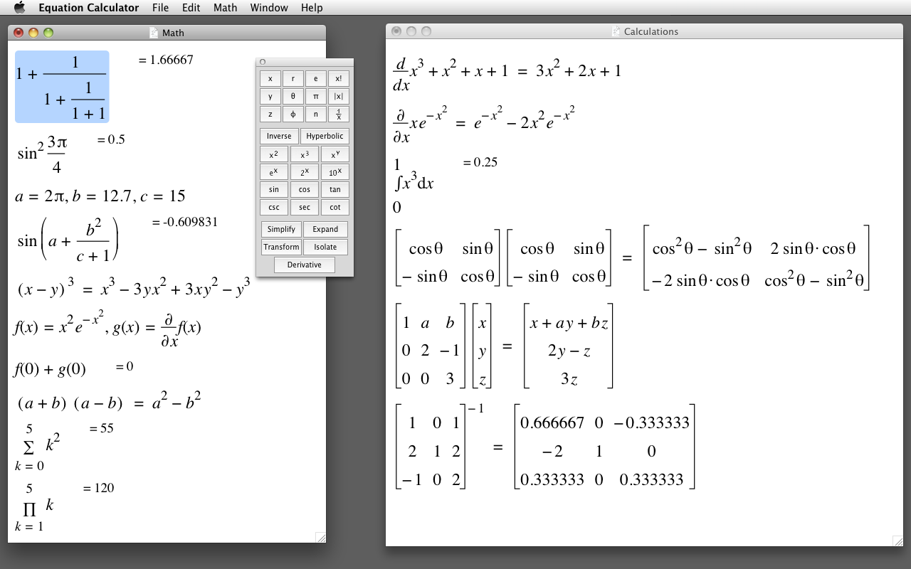 Equation Calculator is a scientific calculator which does symbolic and algebraic manipulation, algebra and calculus as well as numeric computation. You can define variables and functions, evaluate symbolic derivatives, numeric integrals and matrix operations.